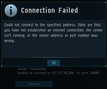 What's really weird for me is that the launcher can see the server status and number of pilots online, but the client doesn't see that info. I get the same thing trying to connect to Singularity as well - http://ibin.co/1sMK5arYUbF7